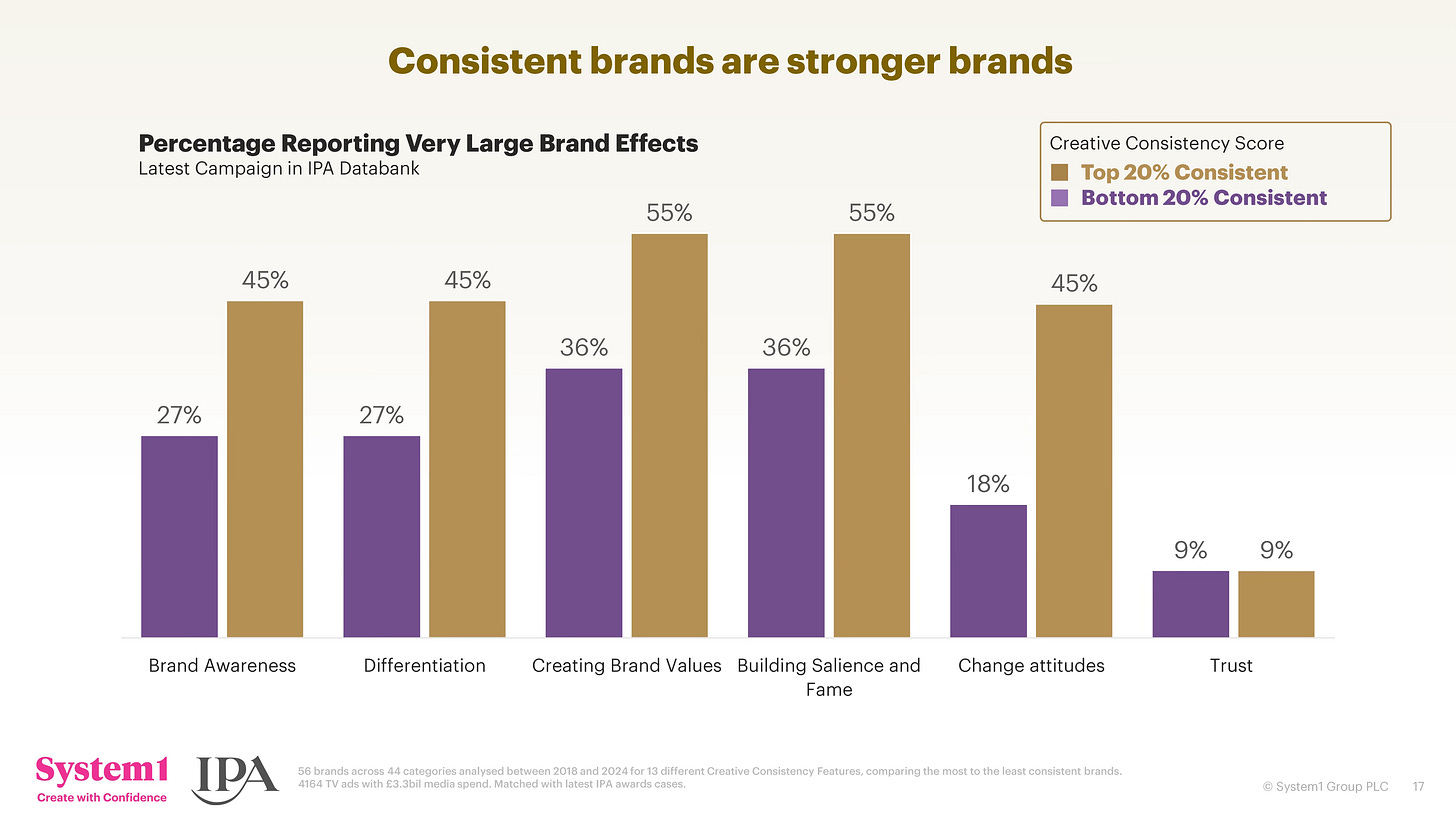 A new report here from System1 called Compound Creativity explores the value of creative consistency. The study analysed more than 4,000 ads over a 5 year period, split brands into three groups (least consistent, somewhat consistent and most consistent) and calculated how each group performed on a number of metrics. The report is worth reading in full. But here’s one the key slides. The most consistent group of brands outperformed the least consistent brands on brand effects (including brand awareness differentiation, creating brand values, building salience and fame and changing attitudes). The report also covers how consistent brands outperform on business effects (including sales value gain, profit gain and market share gain). If you have an ad, or a brand platform, that’s working, keep using it.