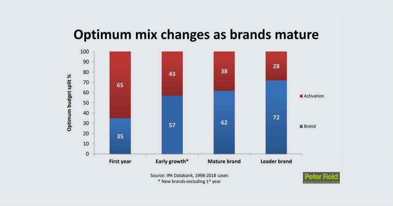 In a recent presentation for Radiocentre, creative consultant Peter Field used IPA data to show how the optimal budget allocation between brand building (emotional, broad reach) and sales activation (rational, tight targeting) communications changes as a brand moves through its lifecycle. The top-line takeaway: new brands should focus on building their sales, mature ones should focus on building their brands.