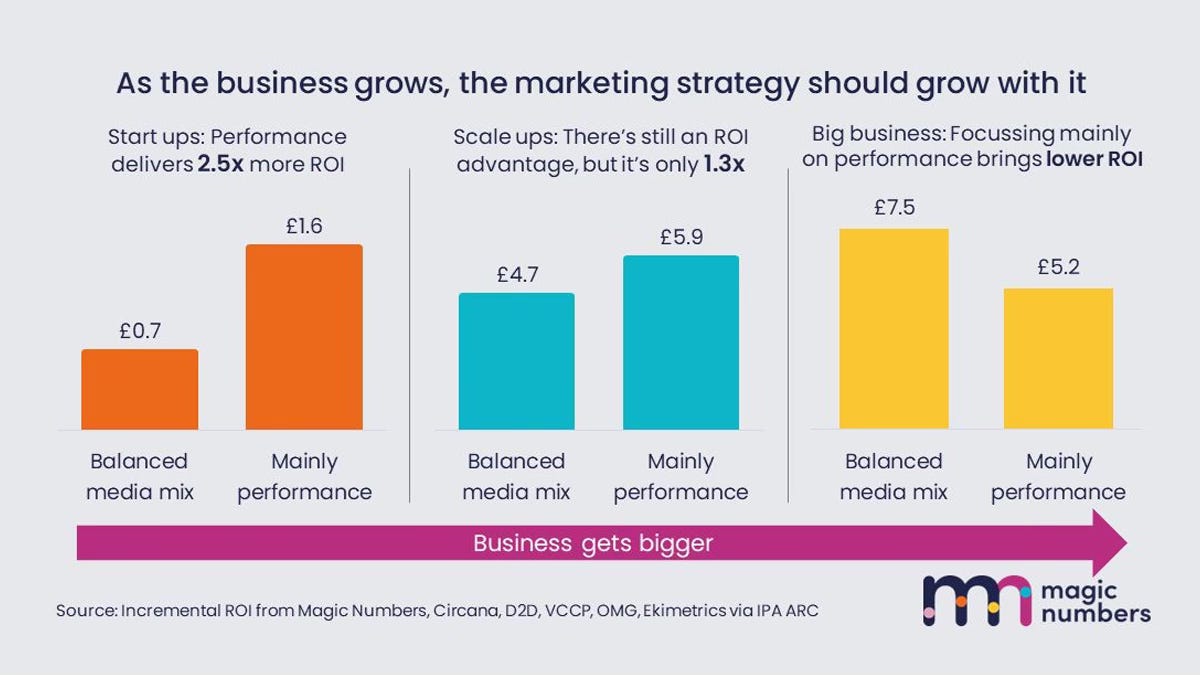 Dr. Grace Kite of Magic Numbers shared a chart that shows a very similar finding to Peter Field (see previous slide), but uses an entirely different dataset and methodology. An econometric study found that for start ups performance (or “sales activation” in Peter Field’s language) deliver 2.5x the ROI of a balanced media mix. As a brand matures from the start up phase to the scale up phase, the returns start to balance out. And when a brand becomes a ‘big business’ a balanced media mix begins to deliver a greater ROI. Again, new brands should focus on building their sales, mature ones should focus on building their brands.