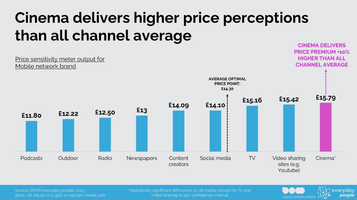 On a similar themes to the last chart, an analysis of nine different media channels by Ian Murray and Andrew Tenzer from Everyday People Research found that cinema had the greatest positive impact on a brand’s price perceptions. Perhaps a broader and more important insight, however, is that all three channels which performed above average on this metric were film (TV, video sharing sites and cinema).