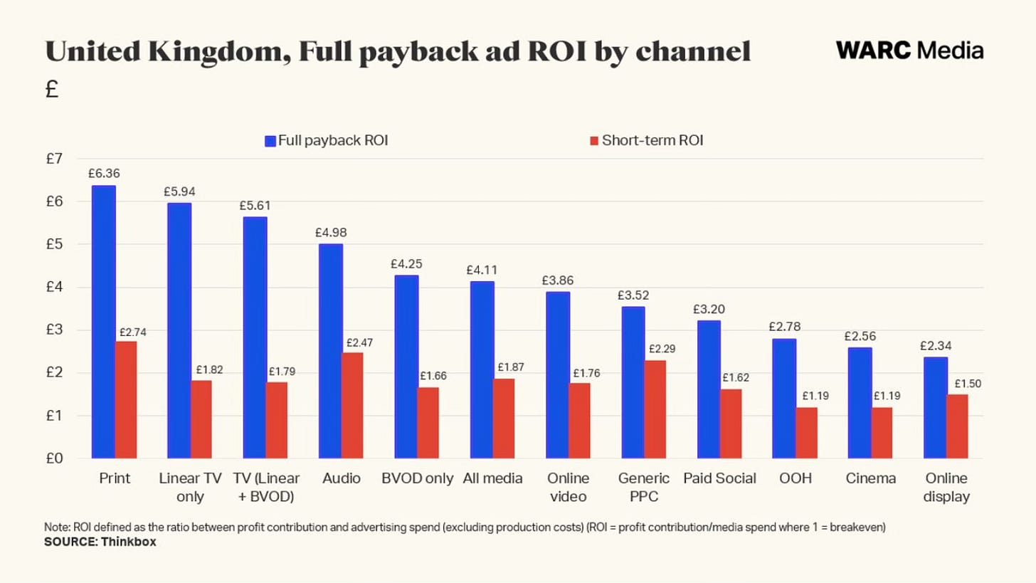 The last two charts beg the question, which communication channels are best for brand building, and which are best for sales activation? A new report from Thinkbox (in partnership with Ebiquity, EssenceMediacom, Gain Theory, Mindshare, and Wavemaker UK) analysed £1.8bn in UK media investment and identified the average short term ROI (up to 13 weeks) and full payback ROI (up to 24 months) by channel. The full report includes much more. Well worth a read.